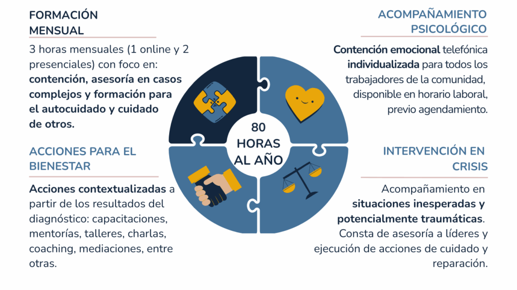 El Acompañamiento Psicológico Individual consiste en un espacio de contención emocional individual, realizado vía telefónica durante la jornada laboral, disponible para los trabajadores del establecimiento. Su propósito es recuperar recursos personales para afrontar situaciones complejas, identificar alertas tempranas de riesgo en salud mental y fortalecer la autoeficacia y las respuestas de acción y cambio.