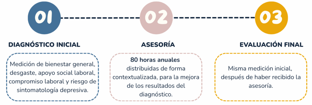 El programa consta de 80 horas de asesoría al año, a distintos actores de la comunidad (trabajadores del establecimiento). Tiene como objetivo acompañar de forma constante y cercana el bienestar de quienes educan, respondiendo preventiva y promocionalmente a la realidad escolar. Las etapas son: